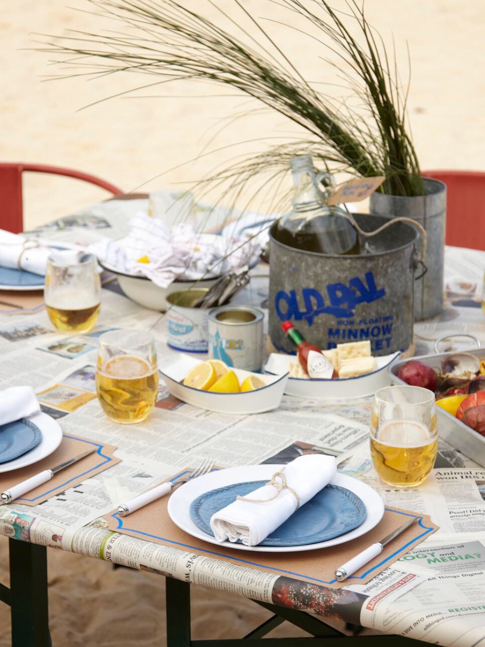 I thought this was too good not to at least think about as a summer entertaining theme. A Lobster Bake themed table setting. The creative decision here lies around using newspaper as your tablecloth, old aluminum pails to hold drinks, rope ties as napkin holders and stemless glasses.
