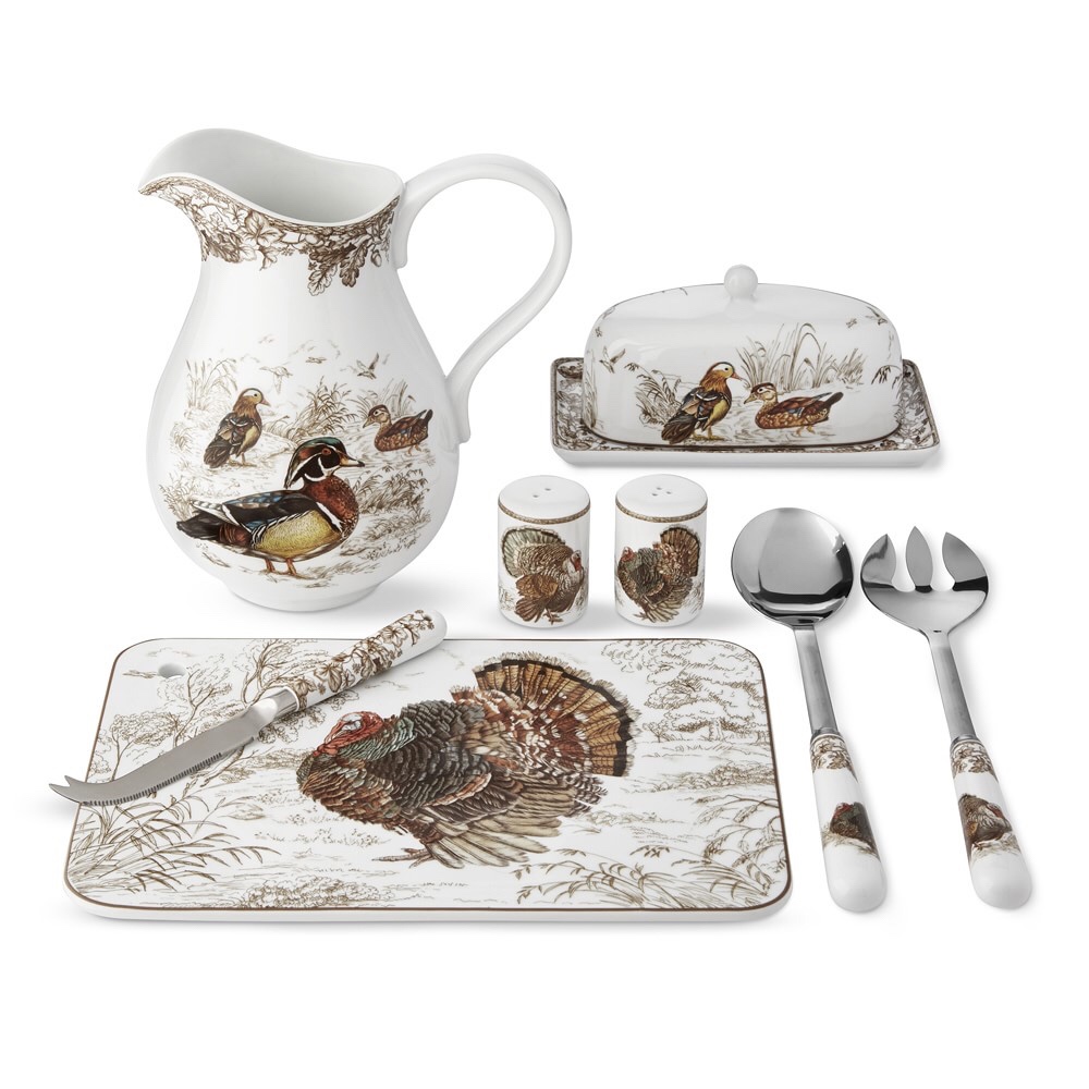 We designed our signature Thanksgiving tableware to play a memorable role in family feasts for years to come. Inspired by 18th-century English transferware patterns, this serving set boasts porcelain handles decorated with a classic scene of a turkey in an autumn woodland.