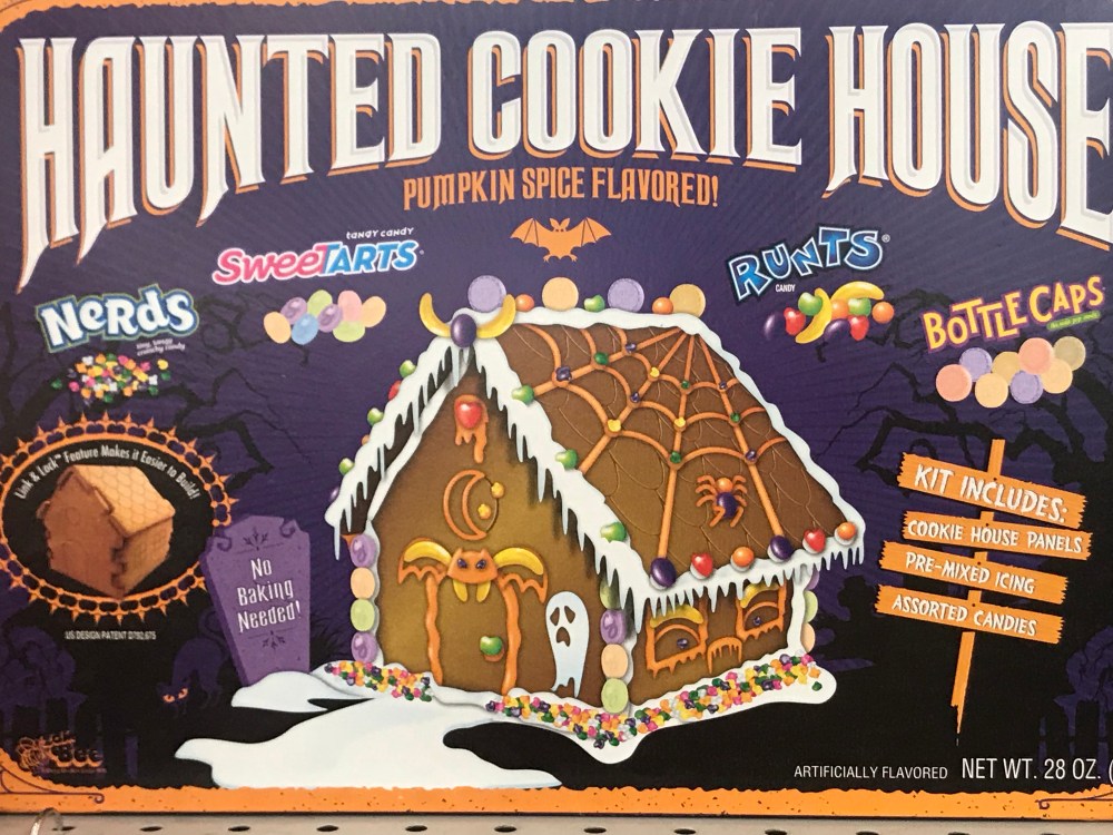 Seen along side Halloween decor, a haunted cookie house, pumpkin spice flavored with decorations that include nerds and sweet tarts. This is your ability to create something you normally enjoy during the Christmas holidays. What you create, is your idea. π