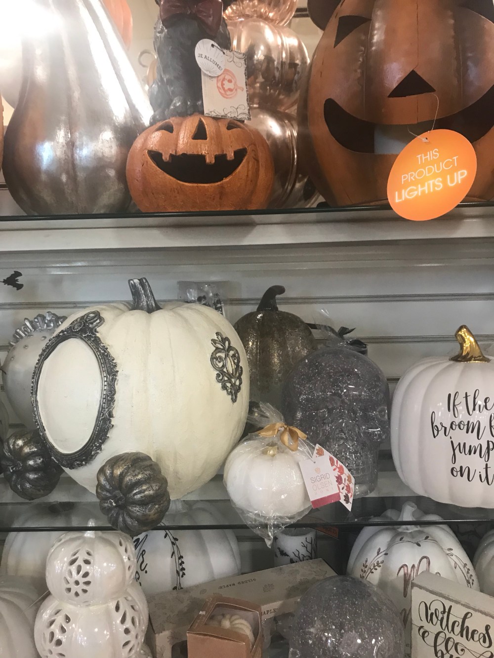 Another array of Halloween decor choices from Home Goods. You think you can never have enough pumpkins or enough white, silver or glitter pumpkins to be exact. Also, a cute saying is a wonderful conversation piece. 🎃