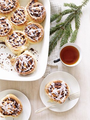 Cinnamon rolls on white plates with silver utensils are an easy classic breakfast idea. Also, a cup of tea and a sprig of evergreen add to this holiday breakfast table.