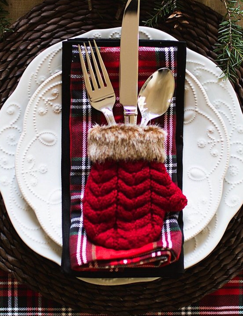 A Christmas mitten to hold the silverware is an adorable way to set a holiday table. Not just any mitten, a crochet mitten with a faux fur inside. A very authentic attempt to creatively display utensils. The plaid napkin is a plus as well as the matching tablecloth. The dark wood placemat underneath the white plates is another way to have a varied color palette. π