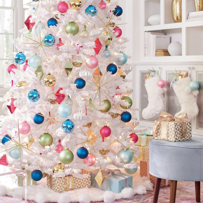 This beautiful white Christmas tree is stocked with an array of colorful ornaments. The faux fur skirt as well as the faux fur stockings are available at Grandinroad.com.