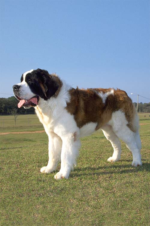 Not ranked particularly high in AKC registrations, this genial giant is nonetheless among the worldâs most famous and beloved breeds. The Saintâs written standard abounds with phrases like âvery powerful,â âextraordinarily muscular,â âimposing,â and âmassive.â A male stands a minimum 27.5 inches at the shoulder; females will be smaller and more delicately built. The huge head features a wrinkled brow, a short muzzle, and dark eyes, combining to give Saints the intelligent, friendly expression that was such a welcome sight to stranded Alpine travelers.)