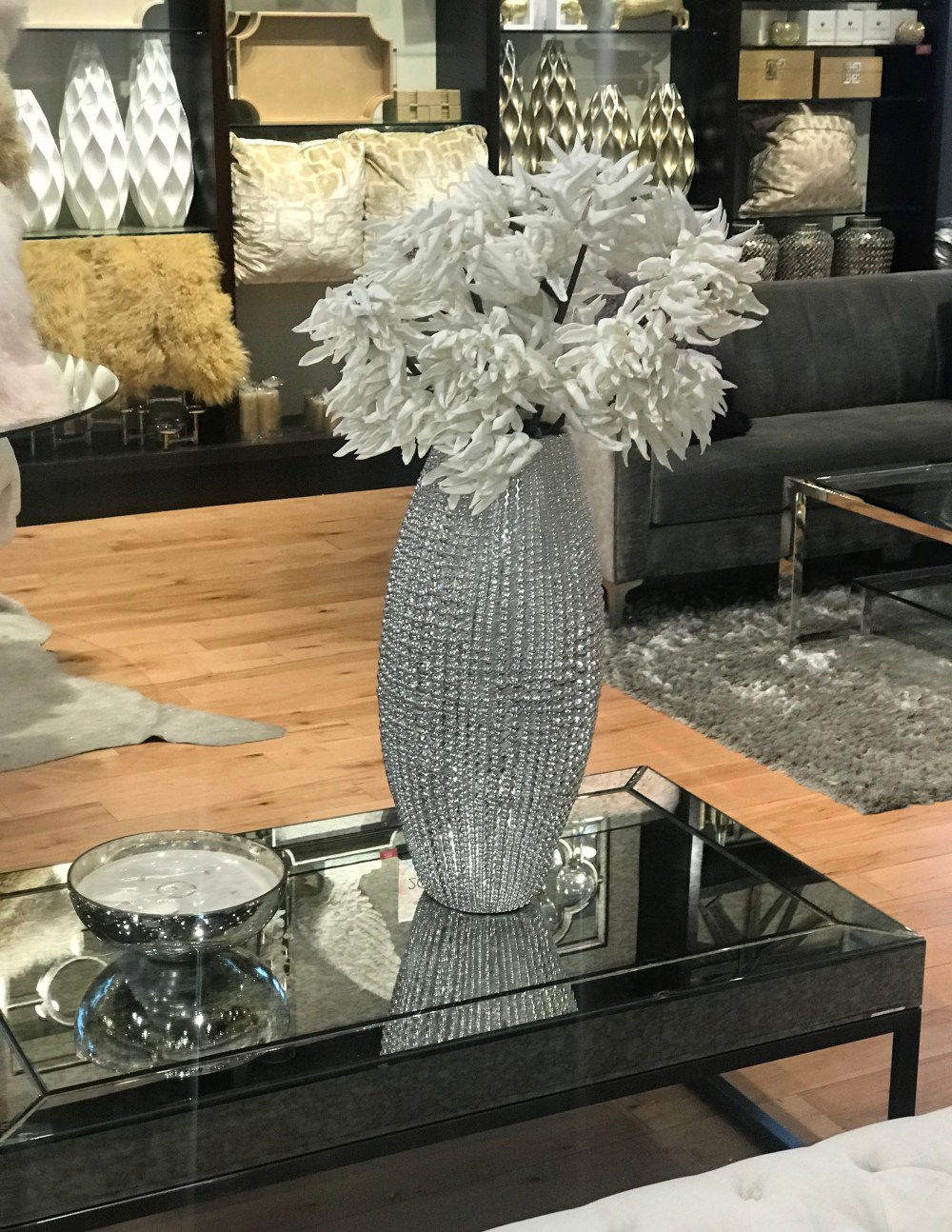 A Z Gallerie tablescape complete with glam vase and trimmings. A mirrored table completes the look with an oversized beautiful candle. Who knew that the bigger the vase, the bigger the glam. 🍶