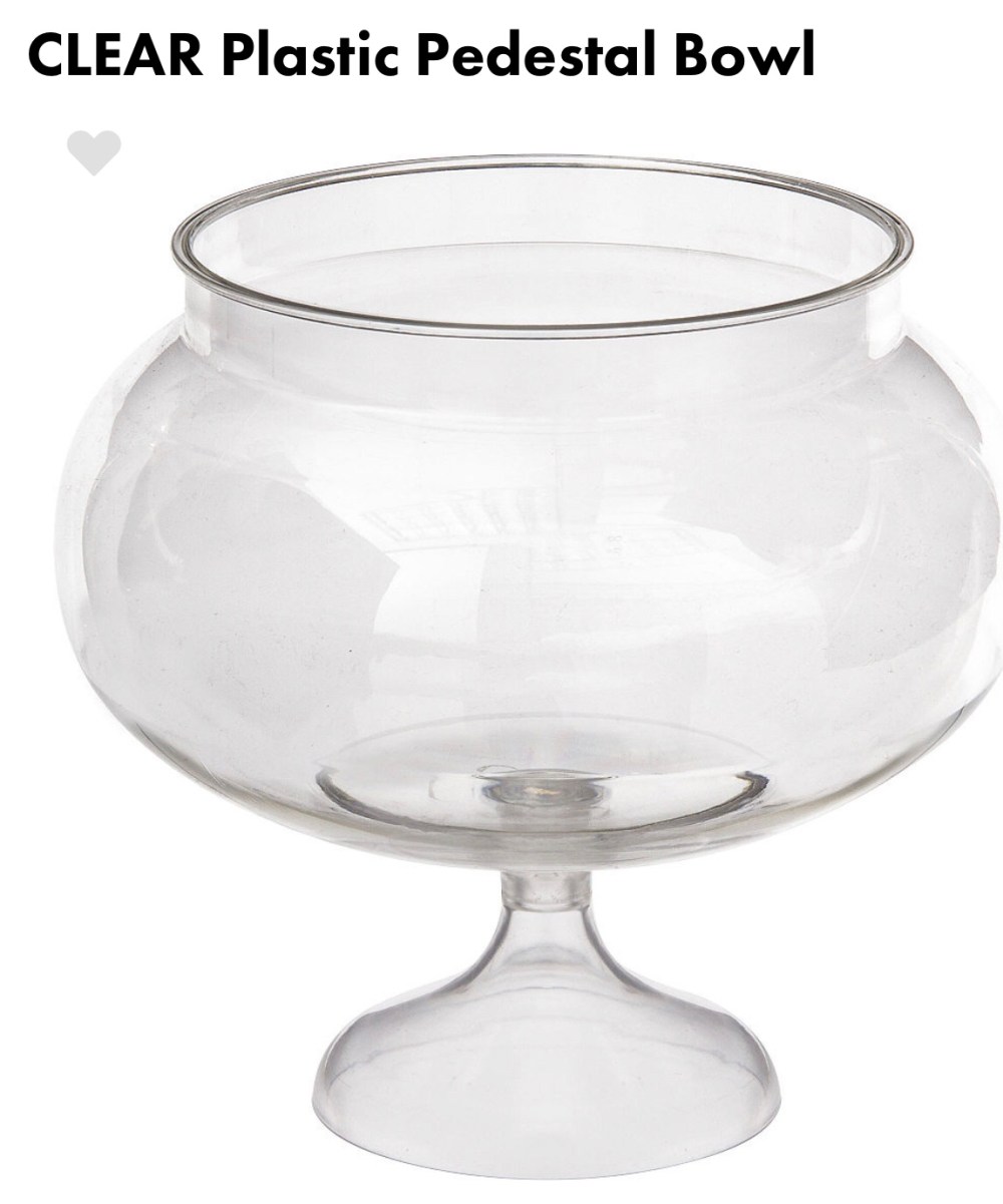 This clear plastic pedestal bowl can be turned into a quick craft when you fill it with chevron silver wrapped peppermints to match a white decor.