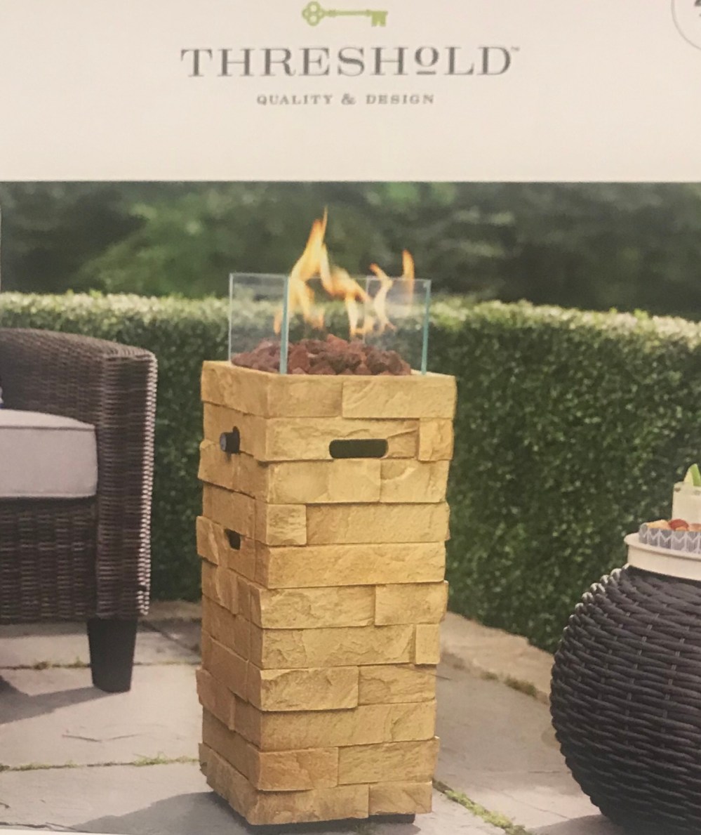 Outdoor dining in the evening made stylish with a fire column. This particular fire pit alternative is available at target.com.