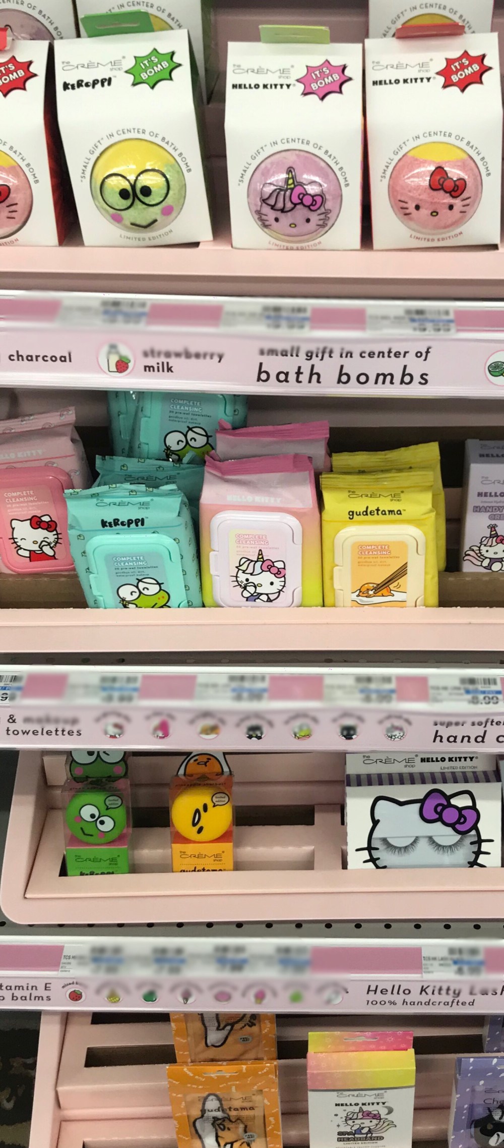 Hello Kitty and Friends beauty essentials include everything from bath bombs, makeup towelettes, vitamin E lip balm and even eyelashes! I remember going to the local San Rio and loving the wonderful assortment of must haves. What a great idea to see so many new and different options. πΊπ‘