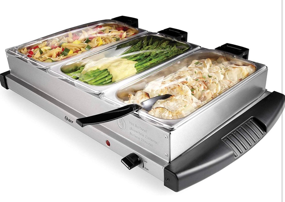 Ideal for entertaining, this convenient buffet server features three separate 2.5-quart buffet pans for keeping food warm and ready to serve. Available at Amazon.com.