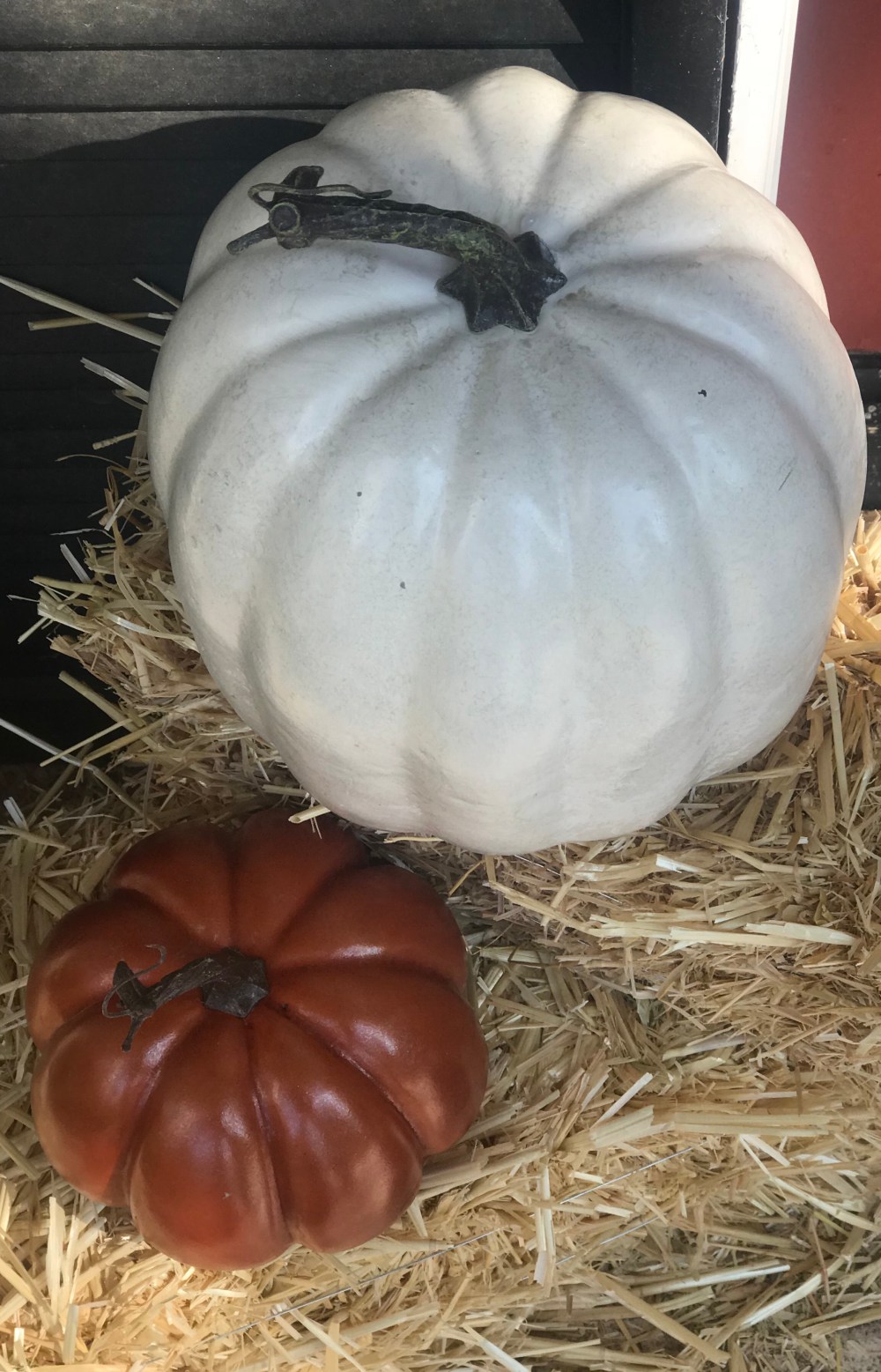 Another photo of my pumpkins on hay that includes a white Pumpkin as well as the obvious decoupage I did to a smaller traditional pumpkin. I opted to use a little metallic paint and silver glitter glue to give it the added shine you see as well as glitter sparkles. 🍂🍁