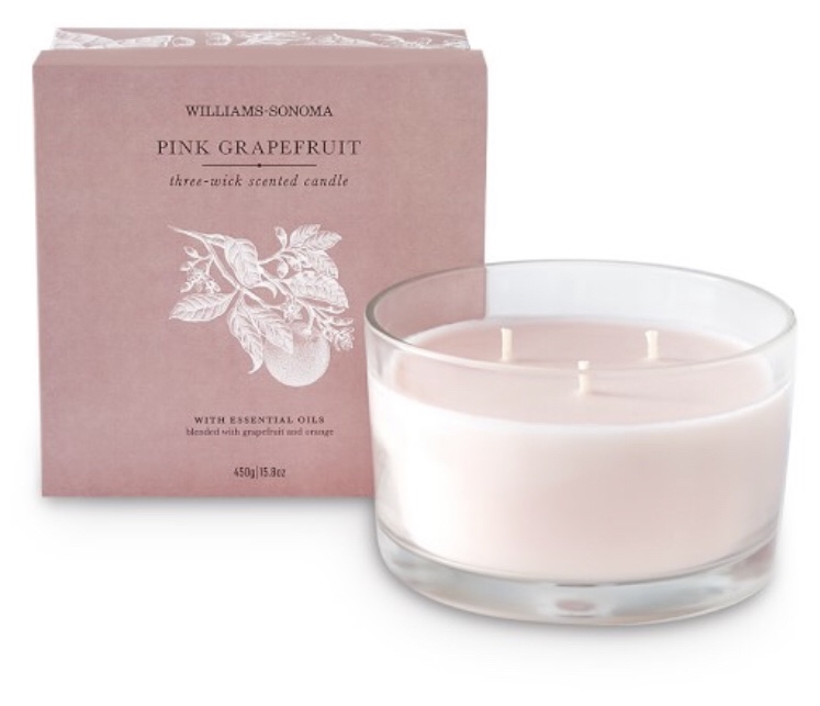 The tangy aroma of grapefruit with a hint of natural orange fragrance and made with quality essential oils. Williams Sonoma 3-Wick Pink Grapefruit Candle