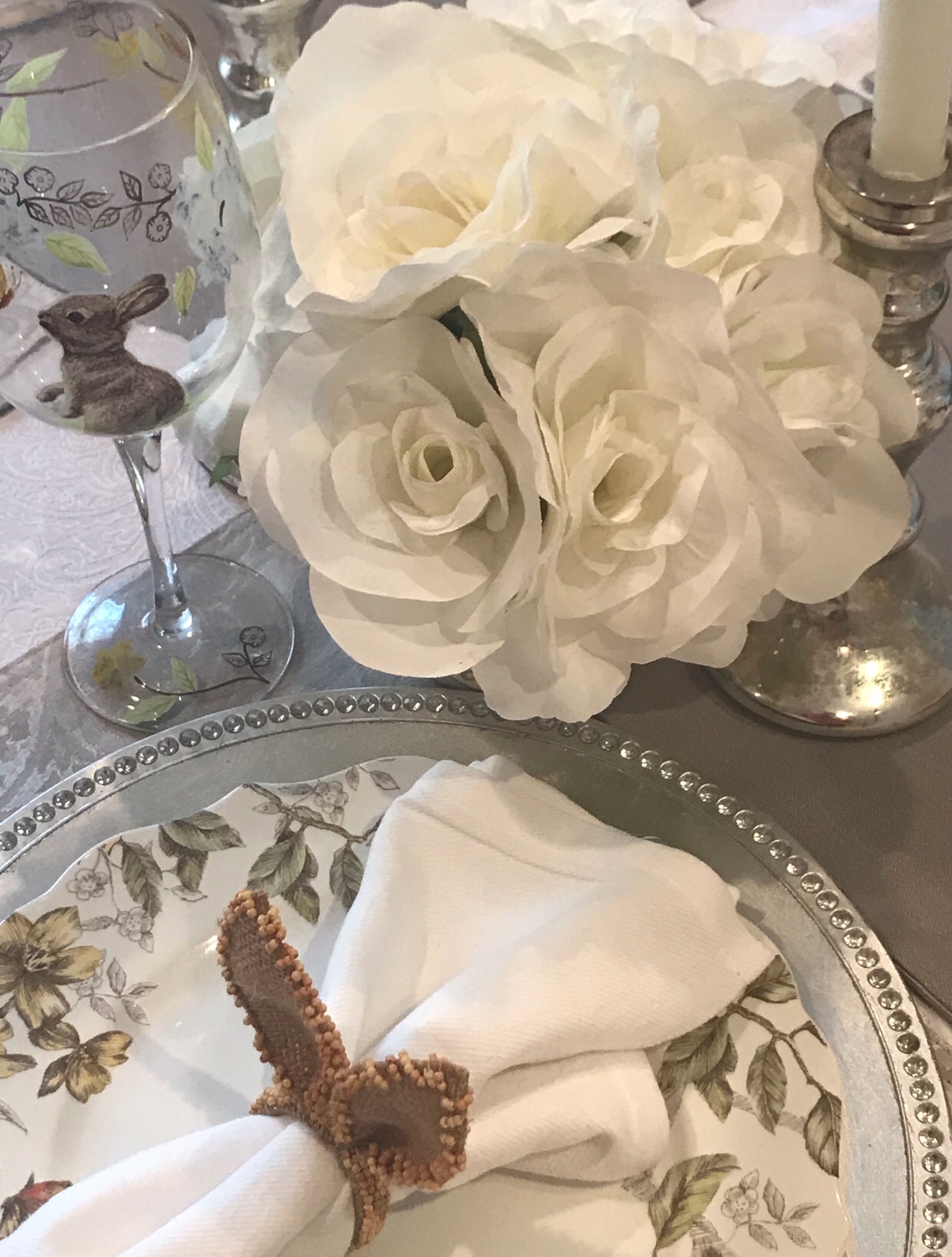 Easter with simple styling means Pier One bunny ear napkin holders, bunny wine glasses, and spring flower imprinted plates. A centerpiece of roses, silver candle stick holder and charges complete the look. ✔️