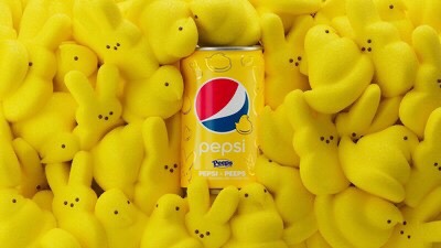 Peeps marshmallows and Pepsi has joined forces to create a drink suitable for Spring. This collaboration includes peep flavored cola in bright yellow, pink and blue colorways. (via pepsico.com)