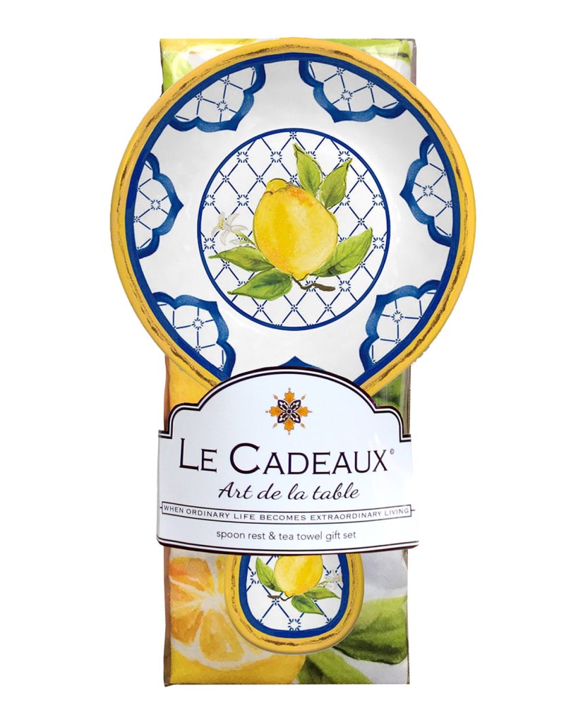 This shatter resistant spoon rest comes with a matching tea towel. A unique gift idea for a casual gathering. Available at horchow.com.