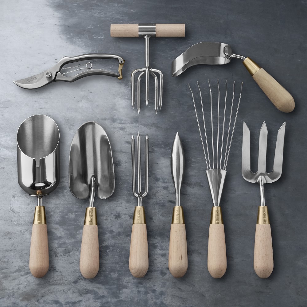 English designer, food writer and avid gardener Sophie Conran created these beautiful, functional tools for use in her own garden. Emphasizing comfort and efficiency, each finely crafted tool is engineered with unique features that simplify everyday gardening jobs. All tools, except for the stainless-steel secateur, combine beech wood handles with brass ferrules and polished steel heads.