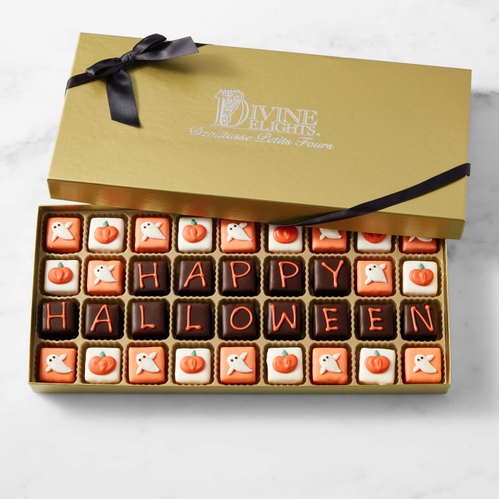 Our Halloween petits fours are so delicious, it’s scary. Each one is a miniature work of art, crafted from the finest ingredients and expertly decorated by hand. The sweet treats feature tiers of vanilla almond cake or chocolate cake layered with pumpkin buttercream, vanilla buttercream and raspberry puree, or bittersweet truffle cream. The petits fours are enrobed in premium chocolate and finished with a festive design. Also, makes a great hostess gift. Available at Williams-Sonoma.com .